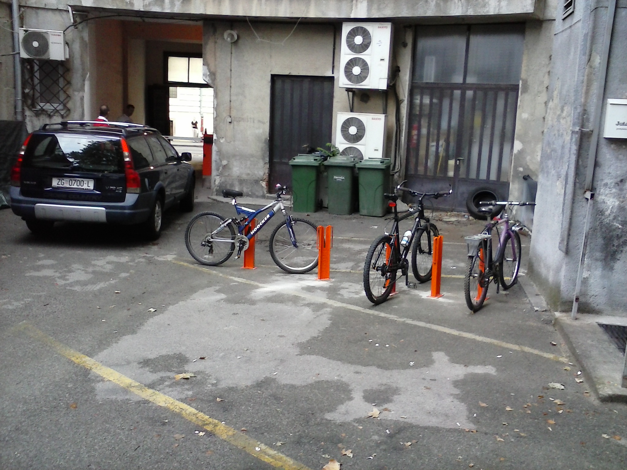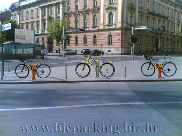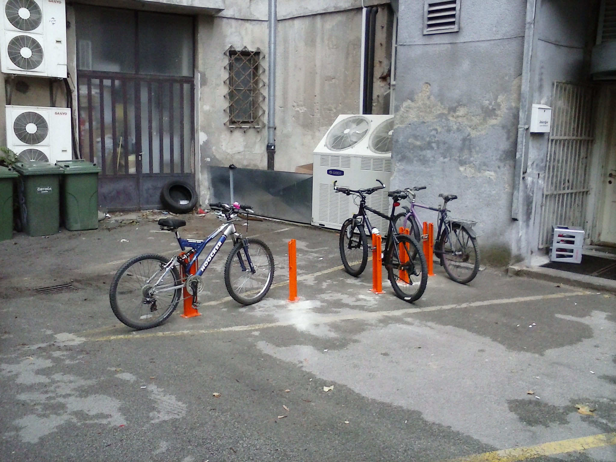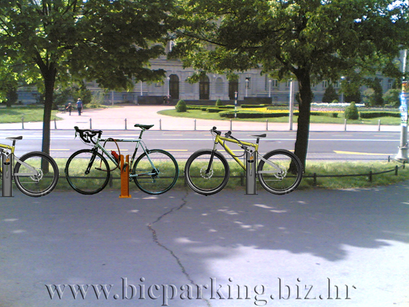 Bicycles stands, or holders, are made of heavy duty steel and foreseen to be bolted to the ground. Bicycle’s pedal is easily inserted into the groove and keeps bicycle steady in upright position, with no possibility to be flipped over. Bicycle is easily secured against the theft by inserting a standard padlock into the hole beside the groove or securing it with conventional chains, U-locks etc. For usage of such conventional antitheft devices, large side bars are provided on each side of the bicycle holders. Six millimeters “H” profile steel will resist any attempt of vandalism.