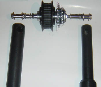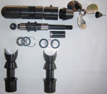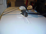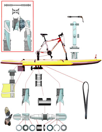 of the rear hub shaft will enable that. Such installation of the bike on the board, gives much more pleasure in riding than ordinary recreational enjoyment. That is to say, placing the bike with its chain, front sprocket-wheels and front and rear gear selectors, we choose the transmission ratio and propeller RPM to adjust force to our ability or to obtain maximum speed. The other words, choice of transmission ratio and speed are almost unlimited. Knowing, that on late bicycle models, ratio between front and rear chain pulley is 5:1 and on this transmission, ratio between upper and lower toothed cog is 2:1 and ability of bicycle rider in average shape to turn pedals 1 1/2 times in second, calculation shows, that in that moment propeller makes 900 RPM. Considering, that with this RPM we are turning propeller with diameter of 200 mm and three blades under the angle of 30 degrees, appears very impressive picture about the speed we achieve. In any case, for riders with higher demands that is not all. Transmission can be modified by exchanging sprocket-wheels with higher ratio ones and increase ratio between upper and lower toothed cogs. Also, propeller can be modified by increasing its blades angle. With such modifications water cycling on the wind surfing board can easily become a sport discipline.