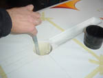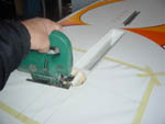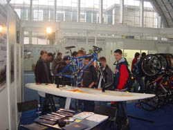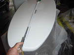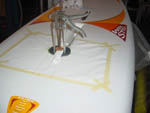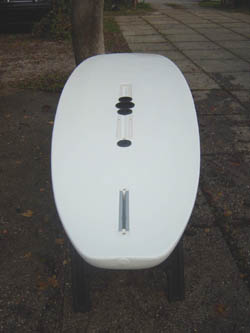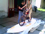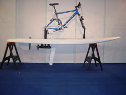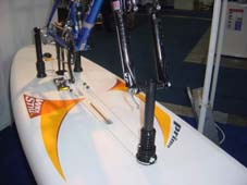 completely useless. For using the same board, during the quiet windless weather in sport and recreational purpose, conversion kit can be assembled and any bicycle can be used for water cycling by removing road wheels only. That means the bicycle in this case becomes dual-purpose equipment too. Preparation for installation of convertible kit on board is very simple. It could be done by board owner himself, in case when convertible kit is purchased separately with installing instructions. Procedure in preparation for installation of convertible kit is: cutting the appropriate holes in the board, where the plastic cups and guides will be glued by expanding foam. With such preparation, Wind Surfing Board is ready for water bicycle riding or wind surfing.